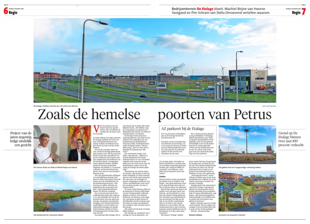 Een interessant project voor Delta, zegt Schram. ,,Alkmaar is toch de hoofdstad van Noord-Holland Noord. Er was veel bedrijvigheid in het centrum en dat moest naar de rand van de stad. Boekelermeer raakte vol en wij zagen de Etalage als mooie oplossing.’’ Ook Hoorne Vastgoed ziet snel de potentie. Reijne: ,,Het project is ook een leuke uitdaging, we doen normaal niet zo veel van dit soort projecten. We zijn meer van woningen en nieuwe vestigingen voor Vomar Voordeelmarkt. Voor ons is het prachtig om hier aan mee te kunnen doen.’’